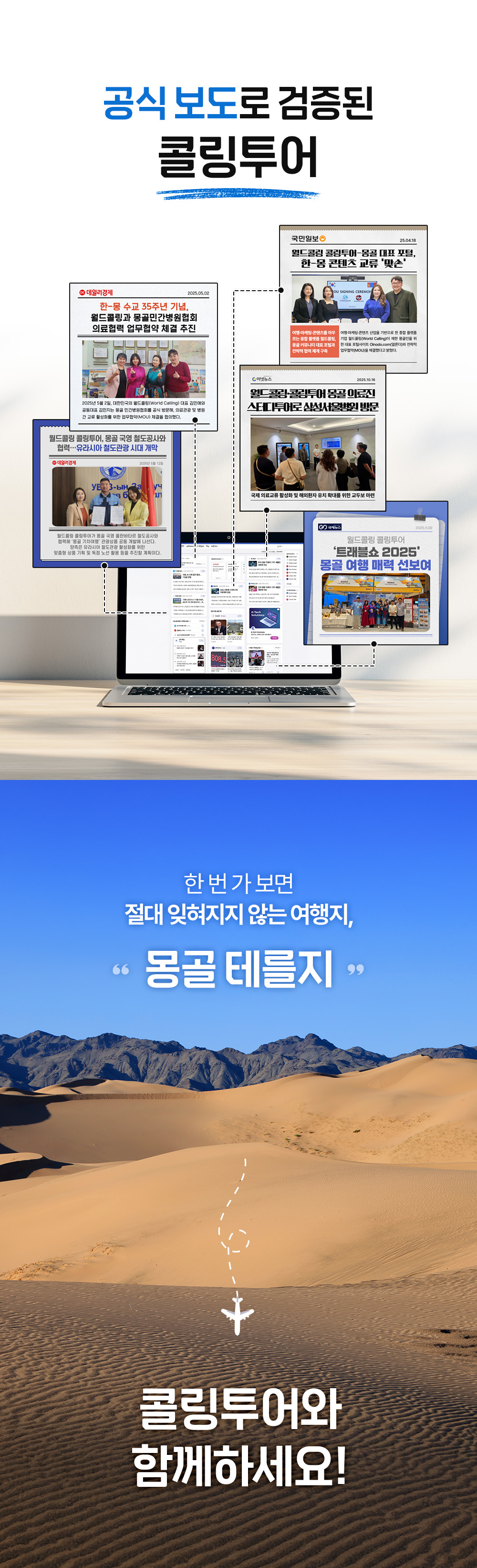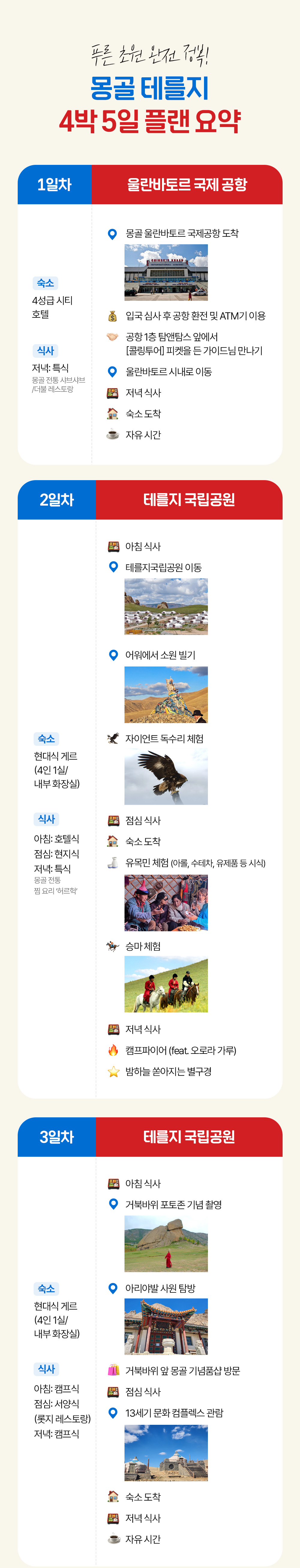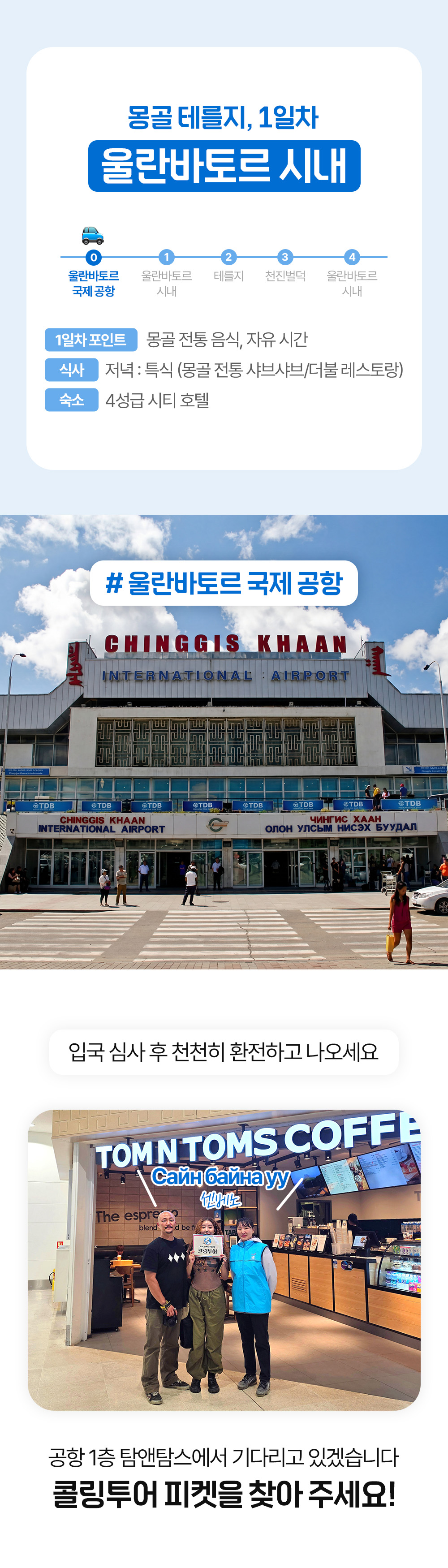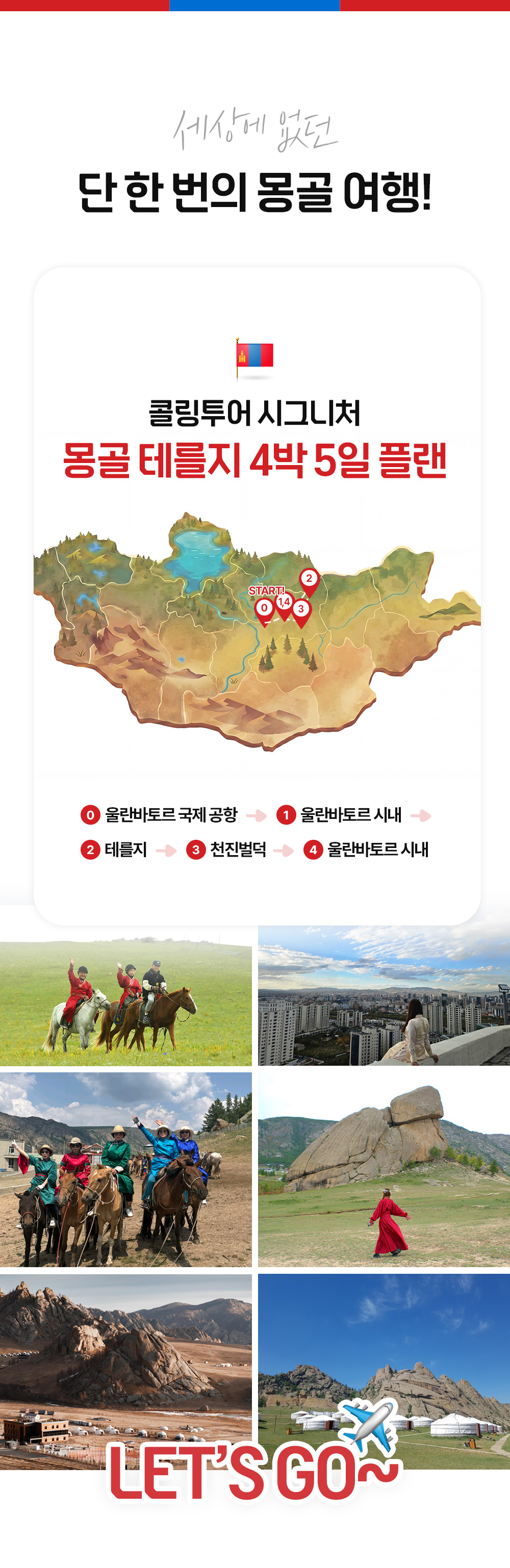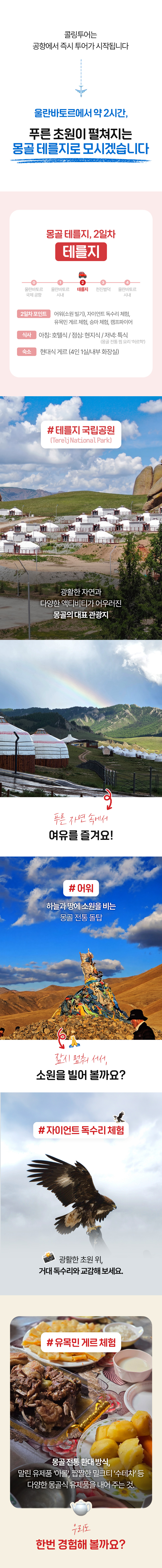 몽골 출장이 계획되어 업무 이후 1박 2일 테를지 투어를 고려하였습니다. 사장님의 만족도를 최우선으로 고려하는 일정을 위하여 여러 투어사에 문의하였습니다. 콜링투…