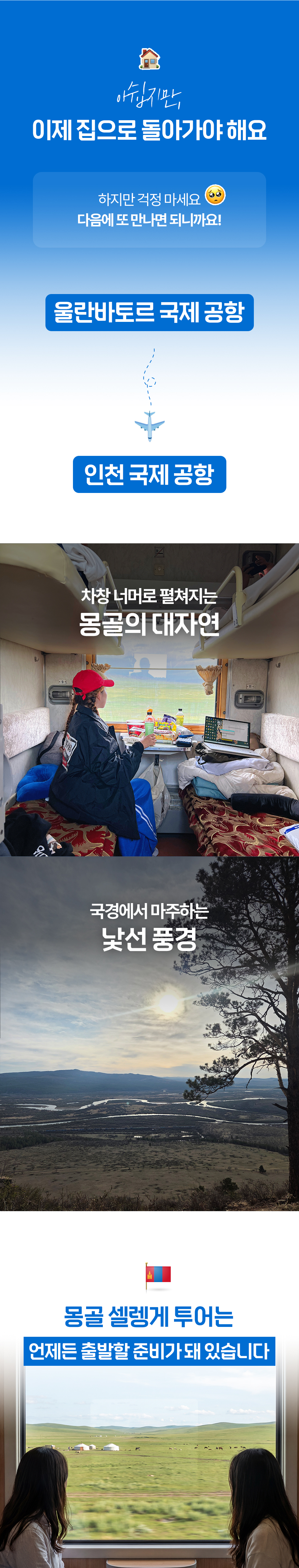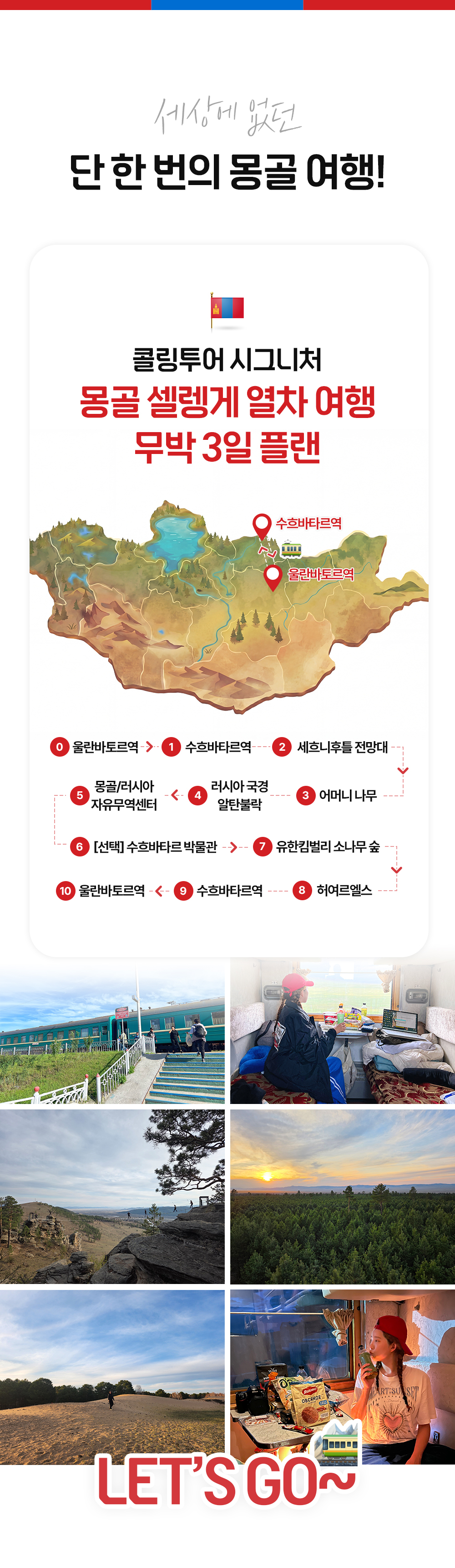 몽골에서 새로운 경험 이었어요! 몽골 횡단 야간 열차를 타고 다녀오는 낭만이 뿜뿜! 여행 당일 날 비가 좀 내려서 날씨가 아쉬웠지만.. 조이 가이드님의 열성적인 …
