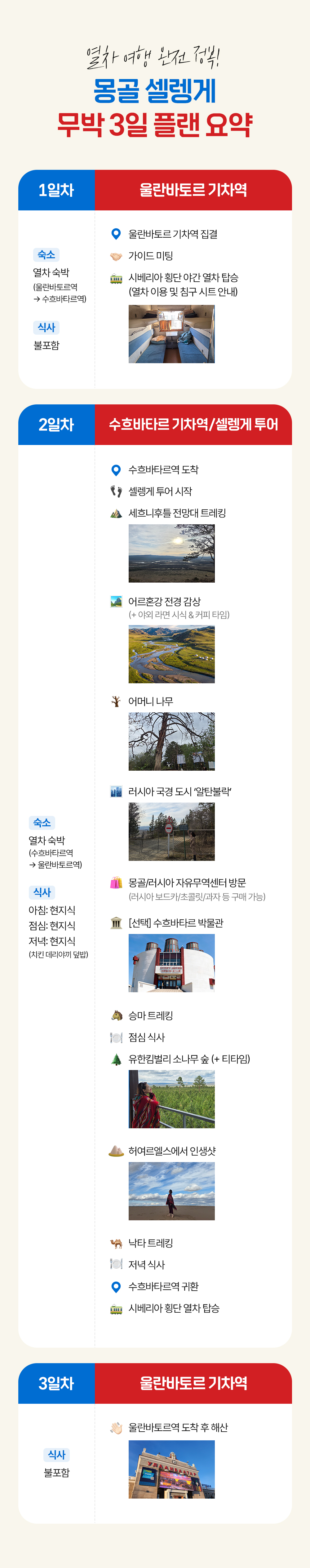 고비사막 투어 후 남은 3일 여행 계획을 세우다 콜링투어를 만나 야간열차타고 셀렝게를 다녀왔습니다. 많이 찾는 여행지가 아니라서 정보가 많이 없었는데 한국 담당자…