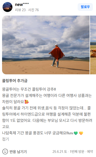 솔직히 몽골 가기 전에 위생,음식 등 걱정이 많았는데... 콜링투어에서 하이엔드급으로 여행을 설계해준 덕분에 불편함이 1도 없었어요. 다음에는 부모님 모시고 다시 방문하려고요.
