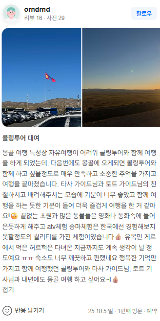 몽골 여행 특성상 자유여행이 어려워 콜링투어와 함께 여행을 하게 되었는데, 다음번에도 몽골에 오게되면 콜링투어와 함께 하고 싶을정도로 매우 만족하고 소중한 추억을 가지고 여행을 끝마쳤습니다. 타사 가이드님과 토트 가이드님의 친절하시고 배려해주시는 모습에 기분이 너무 좋았고 함께 여행을 하는 듯한 기분이 들어 더욱 즐겁게 여행을 한 거 같아요!🙂 끝없는 초원과 많은 동물들은 영화나 동화속에 들어온듯하게 해주고 atv체험 승마체험은 한국에선 경험해보지 못할정도의 퀄리티를 가진 체험이였습니다👍🏼 유목민 게르에서 먹은 허르헉은 다녀온 지금까지도 계속 생각이 날 정도예요 ㅠㅠ 숙소도 너무 깨끗하고 편했네요 행복한 기억만 가지고 함께 여행했던 콜링투어와 타사 가이드님, 토트 기사님과 내년에도 몽골 여행 하고 싶어요~!👍🏼