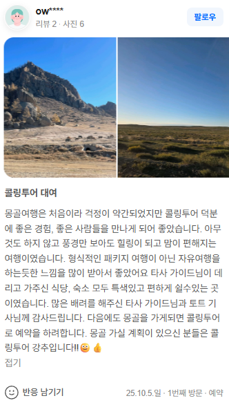 몽골여행은 처음이라 걱정이 약간되었지만 콜링투어 덕분에 좋은 경험, 좋은 사람들을 만나게 되어 좋았습니다. 아무것도 하지 않고 풍경만 보아도 힐링이 되고 맘이 편해지는 여행이였습니다. 형식적인 패키지 여행이 아닌 자유여행을 하는듯한 느낌을 많이 받아서 좋았어요 타사 가이드님이 데리고 가주신 식당, 숙소 모두 특색있고 편하게 쉴수있는 곳이였습니다. 많은 배려를 해주신 타사 가이드님과 토트 기사님께 감사드립니다. 다음에도 몽골을 가게되면 콜링투어로 예약을 하려합니다. 몽골 가실 계획이 있으신 분들은 콜링투어 강추입니다!!🙂👍