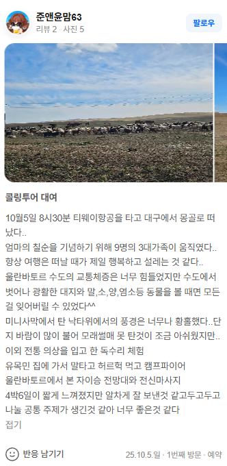몽골 중부 3대 가족여행 (2025.10.05~)