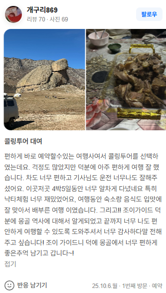 편하게 바로 예약할수있는 여행사여서 콜링투어를 선택하였는데요. 걱정도 많았지만 덕분에 아주 편하게 여행 잘 했습니다. 차도 너무 편하고 기사님도 운전 너무나도 잘해주셨어요. 이곳저곳 4박5일동안 너무 알차게 다녔네요 특히 낙타체험 너무 재밌었어요, 여행동안 숙소랑 음식도 입맛에 잘 맞아서 배부른 여행 이였습니다. 그리고!! 조이가이드 덕분에 몽골 역사에 대해서 알게되었고 끝까지 너무 나도 편안하게 여행할 수 있도록 도와주셔서 너무 감사하다말 전해주고 싶습니다! 조이 가이드니 덕에 몽골에서 너무 편하게 좋은추억 남기고 갑니다~!