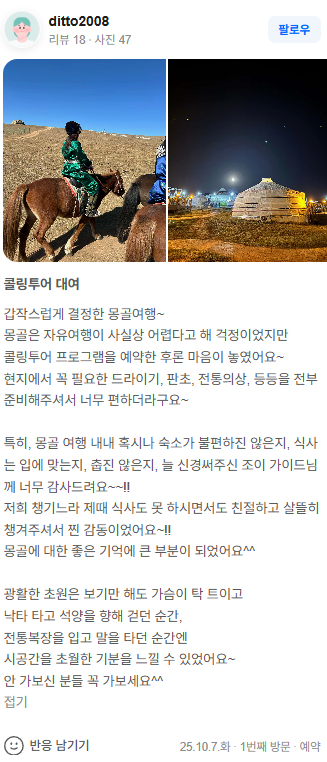 몽골에 대한 좋은 기억에 큰 부분이 되었어요^^