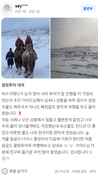 겨울 몽골이 너무나 좋았어서 다음에 기회가 된다면 여름 몽골도 콜링투어와 여행해보고 싶네요 🤍🤍 가이드님 덕분에 친구와 즐거운 추억 많이 쌓았습니다. 감사합니다🤍