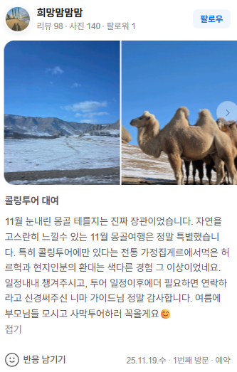 11월 눈내린 몽골 테를지는 진짜 장관이었습니다. 자연을 고스란히 느낄수 있는 11월 몽골여행은 정말 특별했습니다. 특히 콜링투어에만 있다는 전통 가정집게르에서먹은 허르헉과 현지인분의 환대는 색다른 경험 그 이상이었네요.