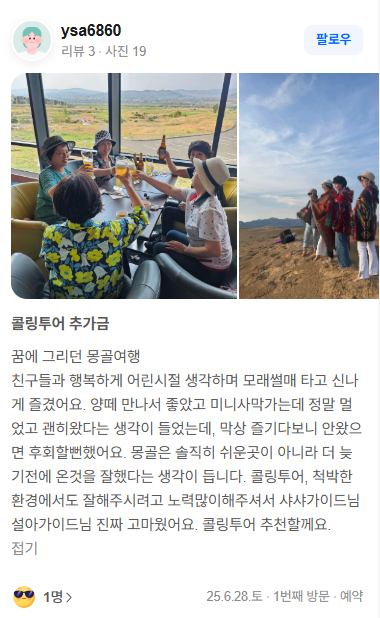 친구들과 행복하게 어린시절 생각하며 모래썰매 타고 신나게 즐겼어요. 양떼 만나서 좋았고 미니사막가는데 정말 멀었고 괜히왔다는 생각이 들었는데, 막상 즐기다보니 안왔으면 후회할뻔했어요. 몽골은 솔직히 쉬운곳이 아니라 더 늦기전에 온것을 잘했다는 생각이 듭니다. 콜링투어, 척박한 환경에서도 잘해주시려고 노력많이해주셔서 샤샤가이드님 설아가이드님 진짜 고마웠어요. 콜링투어 추천할께요.