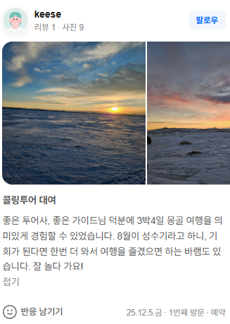 좋은 투어사, 좋은 가이드님 덕분에 3박4일 몽골 여행을 의미있게 경험할 수 있었습니다. 8월이 성수기라고 하니, 기회가 된다면 한번 더 와서 여행을 즐겼으면 하는 바램도 있습니다. 잘 놀다 가요!