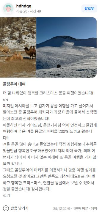그때도 콜링투어의 패키지를 이용하거나 맞춤 여행 설계를 요청드릴 것 같아요! 그만큼 만족도 최상이에요!! 프라이빗하고 행복한 크리스마스, 연말을 몽골에서 보낼 수 있어서 정말 좋았습니다! 감사합니다!