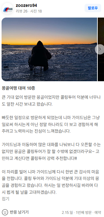 이 자리를 빌어 니마 가이드님께 다시 한번 큰 감사의 마음을 전합니다. 콜링 투어와 가이드님 덕분에 기대 이상의 몽골을 경험하고 왔습니다. 하시는 일 번창하시길 바라며 다시 뵙게 될 날을 고대하겠습니다.