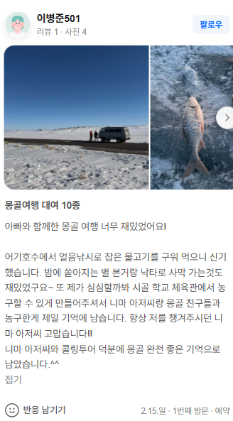 어기호수에서 얼음낚시로 잡은 물고기를 구워 먹으니 신기했습니다. 밤에 쏟아지는 별 본거랑 낙타로 사막 가는것도 재밌었구요~ 또 제가 심심할까봐 시골 학교 체육관에서 농구할 수 있게 만들어주셔서 니마 아저씨랑 몽골 친구들과 농구한게 제일 기억에 남습니다. 항상 저를 챙겨주시던 니마 아저씨 고맙습니다!!