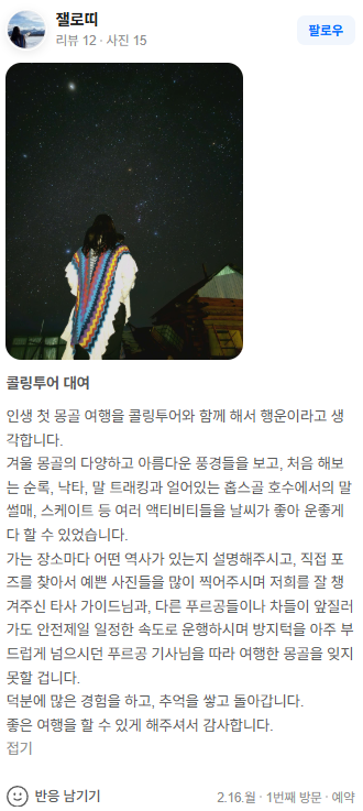 인생 첫 몽골 여행을 콜링투어와 함께 해서 행운이라고 생각합니다.
