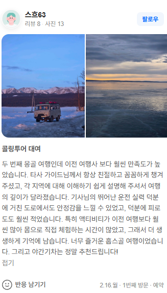 두 번째 몽골 여행인데 이전 여행사 보다 훨씬 만족도가 높았습니다. 타사 가이드님께서 항상 친절하고 꼼꼼하게 챙겨주셨고, 각 지역에 대해 이해하기 쉽게 설명해 주셔서 여행의 깊이가 달라졌습니다. 기사님의 뛰어난 운전 실력 덕분에 거친 도로에서도 안정감을 느낄 수 있었고, 덕분에 피로도도 훨씬 적었습니다. 특히 액티비티가 이전 여행보다 훨씬 많아 몸으로 직접 체험하는 시간이 많았고, 그래서 더 생생하게 기억에 남습니다. 너무 즐거운 홉스골 여행이었습니다. 그리고 야간기차는 정말 추천드립니다!
