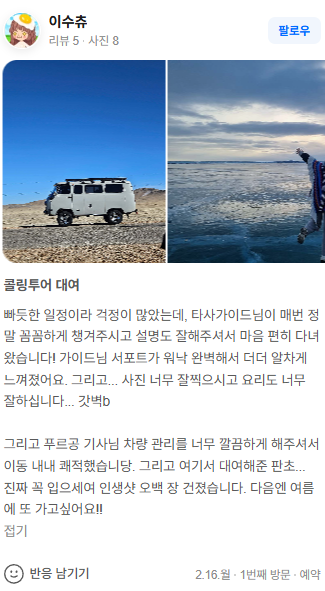 그리고 푸르공 기사님 차량 관리를 너무 깔끔하게 해주셔서 이동 내내 쾌적했습니당. 그리고 여기서 대여해준 판초... 진짜 꼭 입으세여 인생샷 오백 장 건졌습니다. 다음엔 여름에 또 가고싶어요!!