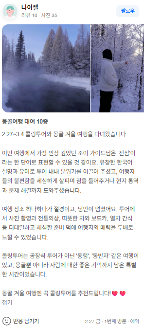 몽골 겨울 여행엔 꼭 콜링투어를 추천드립니다!❤️❤️
