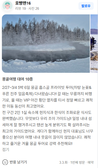 2/27~3/4 5박 6일 몽골 홉스골 프라이빗 투어(차탕 눈꽃&푸른 진주 얼음축제) 다녀왔습니다! 갈 때는 무릉까지 비행기로, 올 때는 VIP 야간 횡단 열차를 타서 정말 빠르고 쾌적한 이동 동선이 최고였어요.