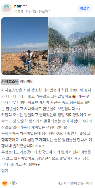 동행투어는 처음이었는데 생각했던것보다 훨씬 더 좋았고 행복했어요. 배려심많고 재미있는 좋은 팀원들을 만나서 여행내내 즐거웠습니다 ㅎㅎㅎ