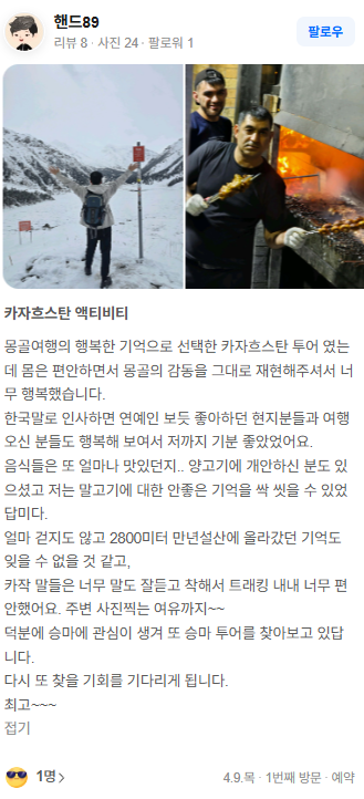 몽골여행의 행복한 기억으로 선택한 카자흐스탄 투어 였는데 몸은 편안하면서 몽골의 감동을 그대로 재현해주셔서 너무 행복했습니다.