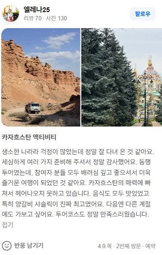 생소한 나라라 걱정이 많았는데 정말 잘 다녀 온 것 같아요. 세심하게 여러 가지 준비해 주셔서 정말 감사했어요. 동행 투어였는데, 참여자 분들 모두 배려심 깊고 좋으셔서 더욱 즐거운 여행이 되었던 것 같아요. 카자흐스탄의 매력에 빠져서 헤어나오지 못하고 있습니다. 음식도 모두 맛있었고 특히 양갈비 샤슬릭이 진짜 최고였어요. 다음엔 다른 계절에도 가보고 싶어요. 투어코스도 정말 만족스러웠습니다.