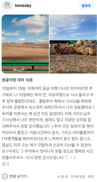 15일부터 19일, 어제까지 몽골 여행 다녀온 따끈따끈한 후기예요 ❛ᴗ❛ 15일에는 투어 전, 자유여행으로 시내 돌려고 하루 일찍 출발한건데도 - 콜링투어 측에서 기사님을 배정해주시며 공항에서 숙소까지 데려다주셔서 너무 감동했어요 ! 투어를 하면서는 매 순간 모든 일정마다 지애 가이드님과 기사님께서 너무 편안하게, 원래도 알고 지냈던 것처럼 잘 대해주셔서 정말 감사했습니다 :) 투어 모든 일정이 잘 짜여져있어서 좋았고, 이동시간부터 음식, 그리고 대여물품까지 ! 여행객들을 배려하셨다는게 느껴져서 평소 탈도 잘나고, 몸살도 자주 오는 제가 무탈하게 건강히 다녀올 수 있었어요 ! 아직도 그 추억에서 벗어나지 못할 정도로 행복한 시간 만들어주셔서 - 다시 한번 감사드립니다 ♡ ‧₊˚
