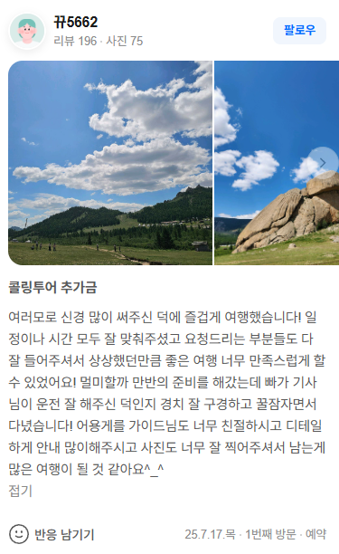 여러모로 신경 많이 써주신 덕에 즐겁게 여행했습니다! 일정이나 시간 모두 잘 맞춰주셨고 요청드리는 부분들도 다 잘 들어주셔서 상상했던만큼 좋은 여행 너무 만족스럽게 할 수 있었어요! 멀미할까 만반의 준비를 해갔는데 빠가 기사님이 운전 잘 해주신 덕인지 경치 잘 구경하고 꿀잠자면서 다녔습니다! 어용게를 가이드님도 너무 친절하시고 디테일하게 안내 많이해주시고 사진도 너무 잘 찍어주셔서 남는게 많은 여행이 될 것 같아요^_^