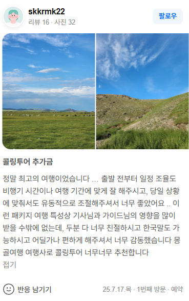 정말 최고의 여행이었습니다 … 출발 전부터 일정 조율도 비행기 시간이나 여행 기간에 맞게 잘 해주시고, 당일 상황에 맞춰서도 유동적으로 조절해주셔서 너무 좋았어요 .. 이런 패키지 여행 특성상 기사님과 가이드님의 영향을 많이 받을 수밖에 없는데, 두분 다 너무 친절하시고 한국말도 가능하시고 어딜가나 편하게 해주셔서 너무 감동했습니다 몽골여행 여행사로 콜링투어 너무너무 추천합니다