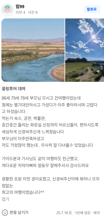 광활한 초원 자연 경이로웠고, 신경써주신덕에 뭐하나 모자람없는