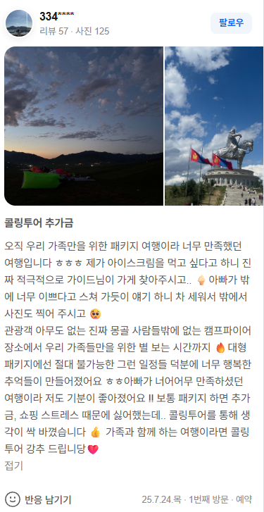 관광객 아무도 없는 진짜 몽골 사람들밖에 없는 캠프파이어 장소에서 우리 가족들만을 위한 별 보는 시간까지 🔥대형 패키지에선 절대 불가능한 그런 일정들 덕분에 너무 행복한 추억들이 만들어졌어요 ㅎㅎ아빠가 너어어무 만족하셨던 여행이라 저도 기분이 좋아졌어요 !! 보통 패키지 하면 추가금, 쇼핑 스트레스 때문에 싫어했는데.. 콜링투어를 통해 생각이 싹 바꼈습니다 👍 가족과 함께 하는 여행이라면 콜링투어 강추 드립니당❤️