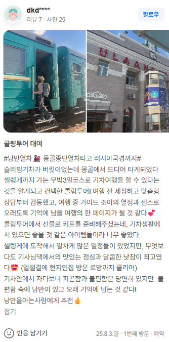 셀렝게까지 가는 무박3일코스로 기차여행을 할 수 있다는 것을 알게되고 컨택한 콜링투어! 여행 전 세심하고 맞춤형 상담부터 감동했고, 여행 중 가이드 조이의 열정과 센스로 오래도록 기억에 남을 여행의 한 페이지가 될 것 같다💕