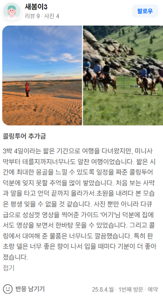 3박 4일이라는 짧은 기간으로 여행을 다녀왔지만, 미니사막부터 테를지까지너무나도 알찬 여행이었습니다. 짧은 시간에 최대한 몽골을 느낄 수 있도록 일정을 짜준 콜링투어 덕분에 잊지 못할 추억을 먾이 쌓았습니다. 처음 보는 사막과 말을 타고 언덕 끝까지 올라가서.초원을 내려다 본 모습은 평생 잊을 수 없을 것 같습니다. 사진 뿐만 아니라 다큐급으로 성심껏 영상을 찍어준 가이드 '어기'님 덕분에 집에서도 영상을 보면서 한바탕 웃을 수 있었습니다. 그리고 콜링에서 대여해 준 물품은 너무나도 깔끔했습니다. 특히 판초랑 델은 너무 좋은 향이 나서 입을 때마다 기분이 더 좋아졌습니다.