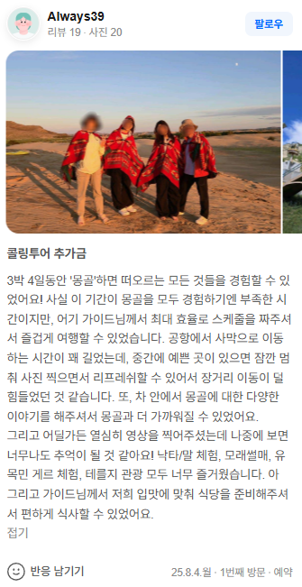 그리고 어딜가든 열심히 영상을 찍어주셨는데 나중에 보면 너무나도 추억이 될 것 같아요! 낙타/말 체험, 모래썰매, 유목민 게르 체험, 테를지 관광 모두 너무 즐거웠습니다. 아 그리고 가이드님께서 저희 입맛에 맞춰 식당을 준비해주셔서 편하게 식사할 수 있었어요.