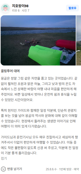 특히 현지인 가이드와 함께한 일정 덕분에, 단순히 관광지를 보는 것을 넘어 몽골의 역사와 문화에 대해 깊이 이해할 수 있었습니다. 현장에서 들려주는 생생한 이야기로 인해 여행이 더 의미 있게 다가왔습니다.