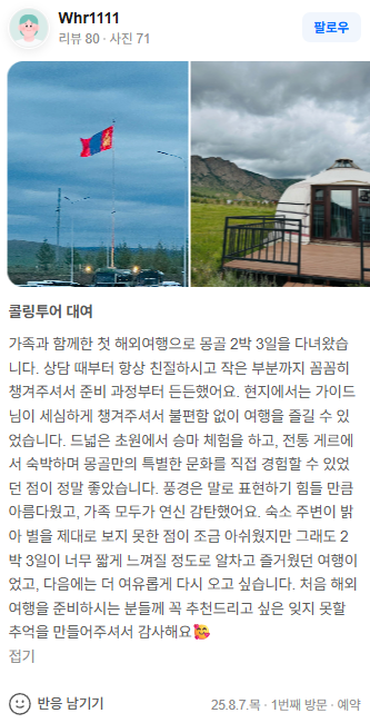 가족과 함께한 첫 해외여행으로 몽골 2박 3일을 다녀왔습니다. 상담 때부터 항상 친절하시고 작은 부분까지 꼼꼼히 챙겨주셔서 준비 과정부터 든든했어요. 현지에서는 가이드님이 세심하게 챙겨주셔서 불편함 없이 여행을 즐길 수 있었습니다. 드넓은 초원에서 승마 체험을 하고, 전통 게르에서 숙박하며 몽골만의 특별한 문화를 직접 경험할 수 있었던 점이 정말 좋았습니다. 풍경은 말로 표현하기 힘들 만큼 아름다웠고, 가족 모두가 연신 감탄했어요. 숙소 주변이 밝아 별을 제대로 보지 못한 점이 조금 아쉬웠지만 그래도 2박 3일이 너무 짧게 느껴질 정도로 알차고 즐거웠던 여행이었고, 다음에는 더 여유롭게 다시 오고 싶습니다. 처음 해외여행을 준비하시는 분들께 꼭 추천드리고 싶은 잊지 못할 추억을 만들어주셔서 감사해요🥰