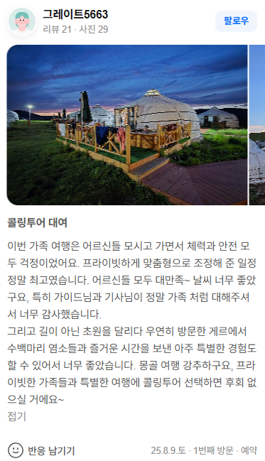 이번 가족 여행은 어르신들 모시고 가면서 체력과 안전 모두 걱정이었어요. 프라이빗하게 맞춤형으로 조정해 준 일정 정말 최고였습니다. 어르신들 모두 대만족~ 날씨 너무 좋았구요, 특히 가이드님과 기사님이 정말 가족 처럼 대해주셔서 너무 감사했습니다.