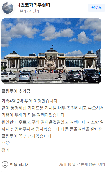 편안한 대우로 친구와 같이온것같았고 여행내내 사소한 일까지 신경써주셔서 감사했습니다 다음 몽골여행을 한다면 콜링투어 꼭 신청하겠습니다