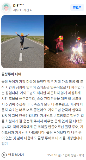 콜링 투어가 가장 마음에 들었던 점은 저희 가족 항공 출 도착 시간과 상황에 맞추어 스케줄을 맞춤식으로 다 짜주었다는 점입니다. 가이드님도 최대한 피곤하지 않게 세심하게 시간 조율을 해주셨구요, 숙소 컨디션등을 매번 잘 체크해서 신경써 주셨습니다. 숙소가 모두 다 훌륭했고, 마지막 테를지 숙소는 너무 너무 좋았어요. 가이드님 한국어 실력과 입맛이 그냥 한국인입니다. 기사님도 비포장도로 험난한 길을 차분하게 잘 운전해 주셔서 아무런 문제 없이 잘 다녀왔습니다. 저희 가족에게 큰 추억을 만들어주신 콜링 투어, 가이드님과 기사님 감사드립니다. 콜링 투어보다 더 나은 곳이 없는 것 같아 다음에도 콜링 투어로 다녀 올 예정입니다.