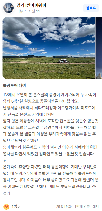 온가족이 휴양만 다녔던 터라 몽골여행이 기대반 우려반이었는데 우리가족에게 특별한 추억을 선물해준 콜링투어에 감사드립니다. 아이들이 너무 좋아했구요 다음에 한번더 몽골 여행을 계획하려고 해요 그때 또 부탁드리겠습니다. ^^