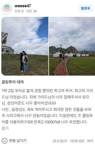 사진 , 동영상도 계속 찍어주시고 최대한 많은 것들을 보여주 시려고해서 너무 감동이었습니다. 다음번에도 또 콜링투어를 이용하려구요!! 만족도10000%!! 너무 추천합니다.