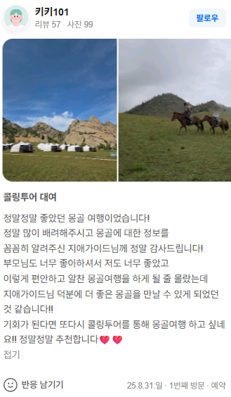 기회가 된다면 또다시 콜링투어를 통해 몽골여행 하고 싶네요!! 정말정말 추천합니다❤️❤️