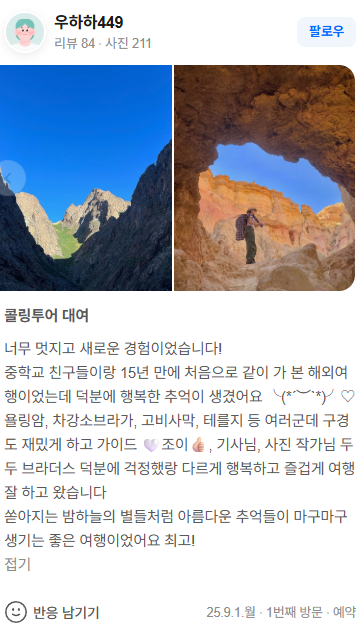 중학교 친구들이랑 15년 만에 처음으로 같이 가 본 해외여행이었는데 덕분에 행복한 추억이 생겼어요 ╰(*´︶`*)╯♡ 욜링암, 차강소브라가, 고비사막, 테를지 등 여러군데 구경도 재밌게 하고 가이드 🤍조이👍🏻, 기사님, 사진 작가님 두두 브라더스 덕분에 걱정했랑 다르게 행복하고 즐겁게 여행 잘 하고 왔습니다