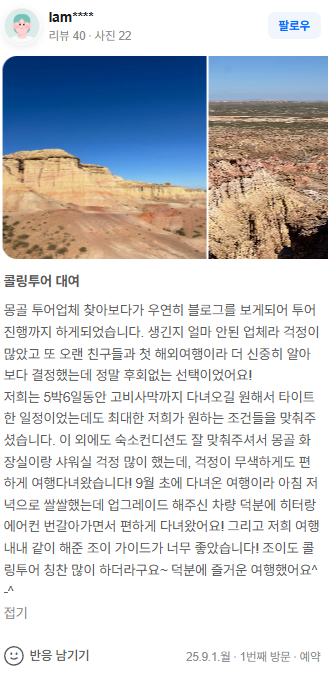 저희는 5박6일동안 고비사막까지 다녀오길 원해서 타이트한 일정이었는데도 최대한 저희가 원하는 조건들을 맞춰주셨습니다. 이 외에도 숙소컨디션도 잘 맞춰주셔서 몽골 화장실이랑 샤워실 걱정 많이 했는데, 걱정이 무색하게도 편하게 여행다녀왔습니다! 9월 초에 다녀온 여행이라 아침 저녁으로 쌀쌀했는데 업그레이드 해주신 차량 덕분에 히터랑 에어컨 번갈아가면서 편하게 다녀왔어요! 그리고 저희 여행내내 같이 해준 조이 가이드가 너무 좋았습니다! 조이도 콜링투어 칭찬 많이 하더라구요~ 덕분에 즐거운 여행했어요^-^