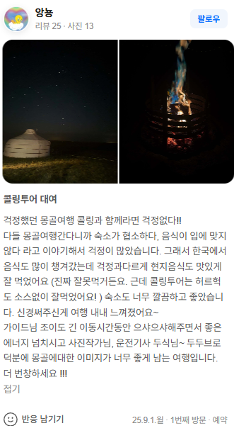 다들 몽골여행간다니까 숙소가 협소하다, 음식이 입에 맞지않다 라고 이야기해서 걱정이 많았습니다. 그래서 한국에서 음식도 많이 챙겨갔는데 걱정과다르게 현지음식도 맛있게 잘 먹었어요 (진짜 잘못먹거든요. 근데 콜링투어는 허르헉도 소스없이 잘먹었어요! ) 숙소도 너무 깔끔하고 좋았습니다. 신경써주신게 여행 내내 느껴졌어요~