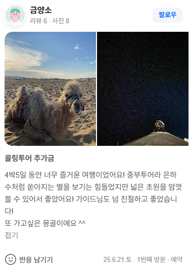 4박5일 동안 너무 즐거운 여행이었어요! 중부투어라 은하수처럼 쏟아지는 별을 보기는 힘들었지만 넓은 초원을 맘껏 볼 수 있어서 좋았어요! 가이드님도 넘 친절하고 좋았습니다!