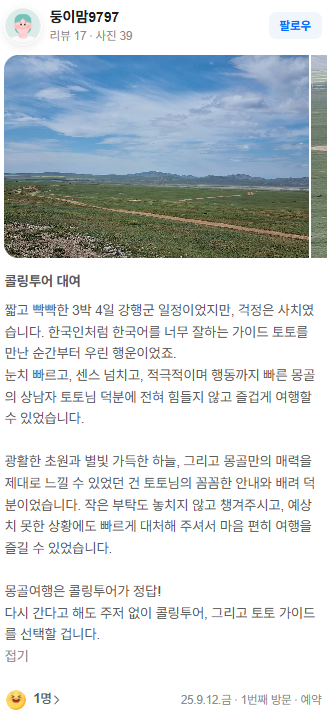 광활한 초원과 별빛 가득한 하늘, 그리고 몽골만의 매력을 제대로 느낄 수 있었던 건 토토님의 꼼꼼한 안내와 배려 덕분이었습니다. 작은 부탁도 놓치지 않고 챙겨주시고, 예상치 못한 상황에도 빠르게 대처해 주셔서 마음 편히 여행을 즐길 수 있었습니다.