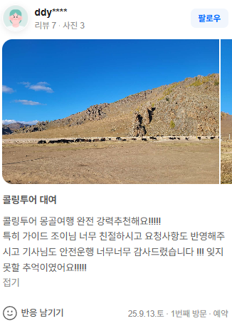 콜링투어 몽골여행 완전 강력추천해요!!!!!