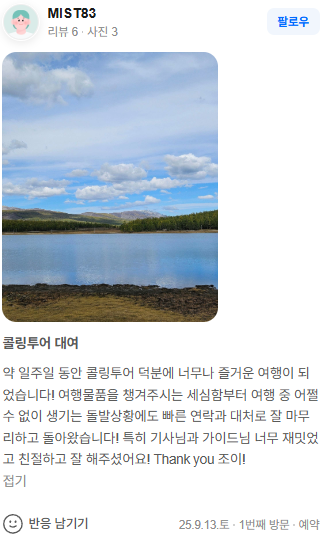 약 일주일 동안 콜링투어 덕분에 너무나 즐거운 여행이 되었습니다! 여행물품을 챙겨주시는 세심함부터 여행 중 어쩔 수 없이 생기는 돌발상황에도 빠른 연락과 대처로 잘 마무리하고 돌아왔습니다! 특히 기사님과 가이드님 너무 재밋었고 친절하고 잘 해주셨어요! Thank you 조이!