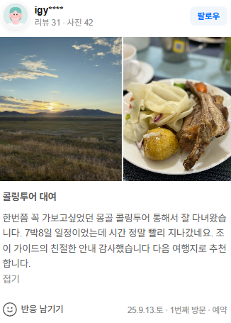 한번쯤 꼭 가보고싶었던 몽골 콜링투어 통해서 잘 다녀왔습니다. 7박8일 일정이었는데 시간 정말 빨리 지나갔네요. 조이 가이드의 친절한 안내 감사했습니다 다음 여행지로 추천합니다.