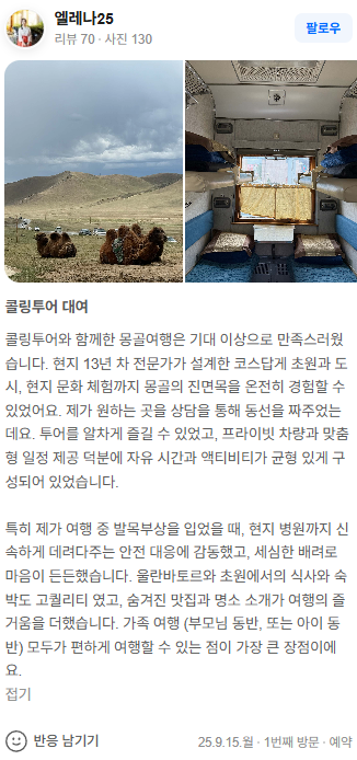 특히 제가 여행 중 발목부상을 입었을 때, 현지 병원까지 신속하게 데려다주는 안전 대응에 감동했고, 세심한 배려로 마음이 든든했습니다. 울란바토르와 초원에서의 식사와 숙박도 고퀄리티 였고, 숨겨진 맛집과 명소 소개가 여행의 즐거움을 더했습니다. 가족 여행 (부모님 동반, 또는 아이 동반) 모두가 편하게 여행할 수 있는 점이 가장 큰 장점이에요.