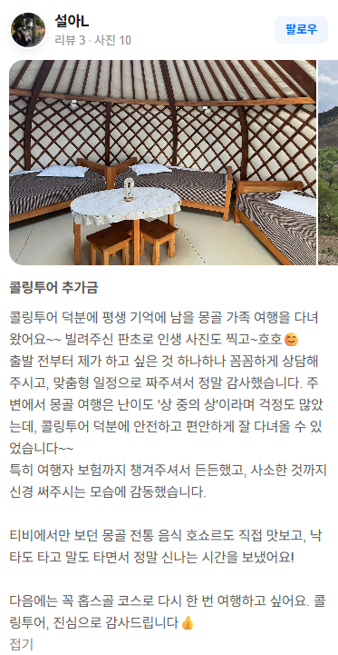 출발 전부터 제가 하고 싶은 것 하나하나 꼼꼼하게 상담해주시고, 맞춤형 일정으로 짜주셔서 정말 감사했습니다. 주변에서 몽골 여행은 난이도 '상 중의 상'이라며 걱정도 많았는데, 콜링투어 덕분에 안전하고 편안하게 잘 다녀올 수 있었습니다~~